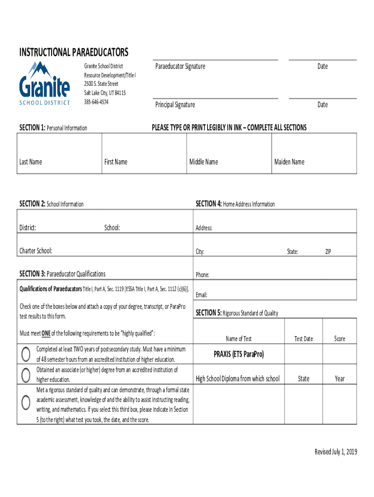 CLEARINSTRUCTIONAL PARAEDUCATORSGranite School District Resource Development/Title I 2500 S. State Street Salt Lake City, UT 84115 3856464574SECTION 1: Personal Information Last NameParaeducator SignatureDatePrincipal