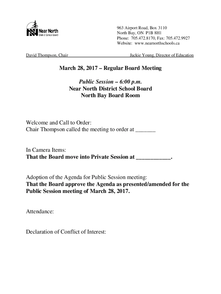 963 Airport Road, Box 3110 North Bay, ON P1B 8H1 Phone: 705.472.8170, Fax: 705.472.9927 Website: www.nearnorthschools.ca David Thompson, Chair Jackie Young, Director of Education March 28, 2017, Regular
