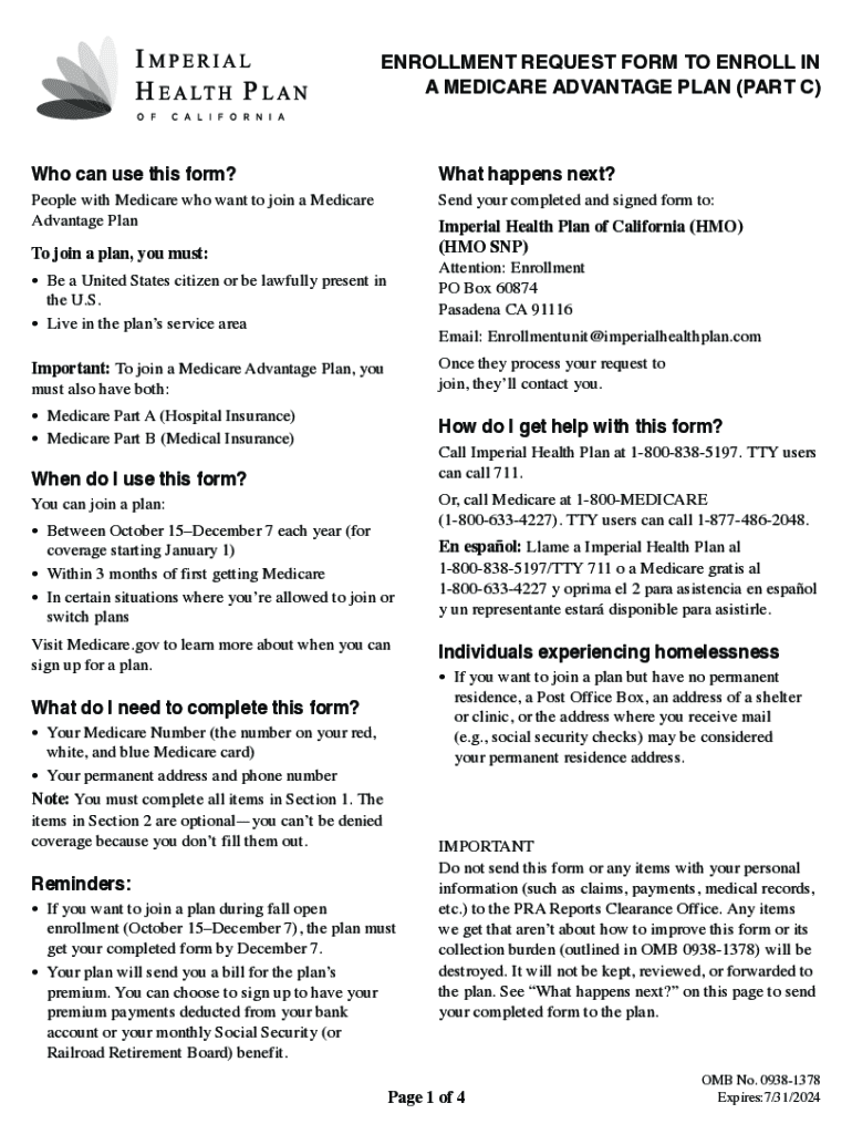 ENROLLMENT REQUEST FORM TO ENROLL IN A MEDICARE ADVANTAGE PLAN (PART C)Who can use this form? What happens next? People with Medicare who want to join a Medicare Advantage Plan Send your completed
