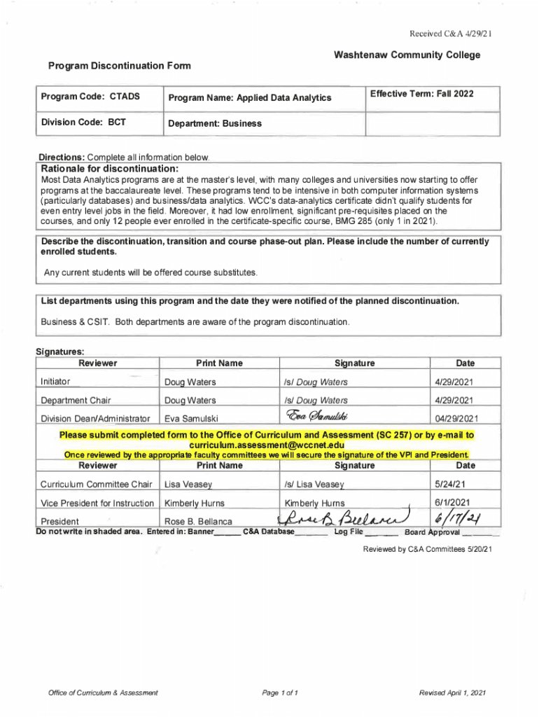 Received C&A 4/29/21Washtenaw Community CollegeProgram Discontinuation Form Program Code: CTADSProgram Name: Applied Data AnalyticsDivision Code: Department: BusinessEffective Term: Fall 2022Directions: