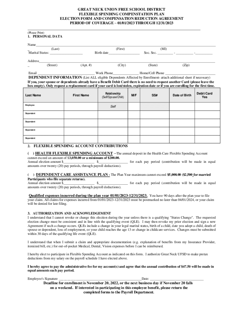GREAT NECK UNION FREE SCHOOL DISTRICT FLEXIBLE SPENDING COMPENSATION PLAN ELECTION FORM AND COMPENSATION REDUCTION AGREEMENT PERIOD OF COVERAGE 01/01/2023 THROUGH 12/31/2023___ (Please Print)1. PERSONAL