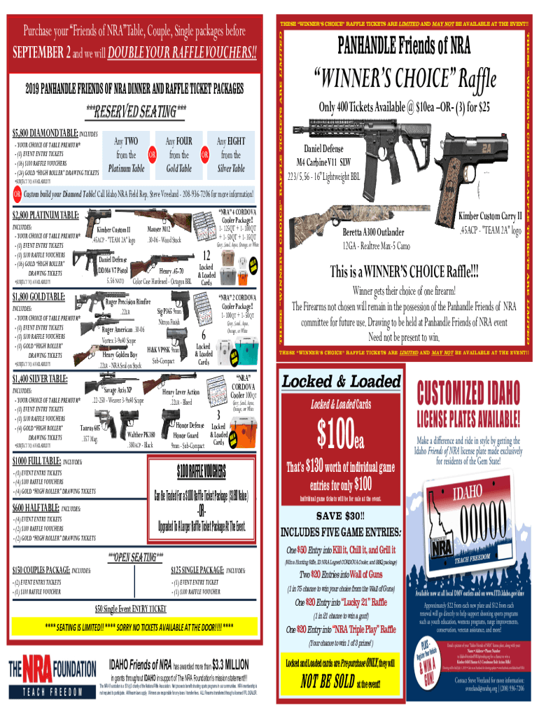 2019 PANHANDLE FRIENDS OF NRA DINNER AND RAFFLE TICKET PACKAGES***Reserved seating***