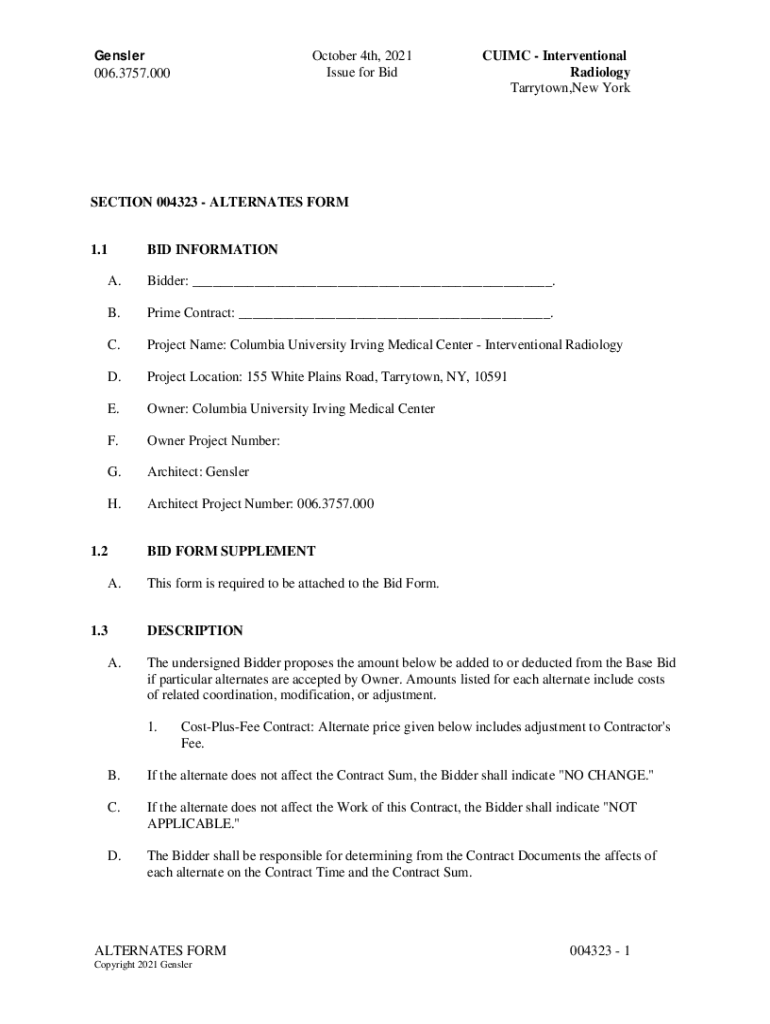 Gentler 006.3757.000October 4th, 2021 Issue for Biscuit Interventional Radiology Tarry town, New Correction 004323 ALTERNATES FORM 1.1BID INFORMATION. Bidder: ___. B. Prime Contract: ___. C. Project