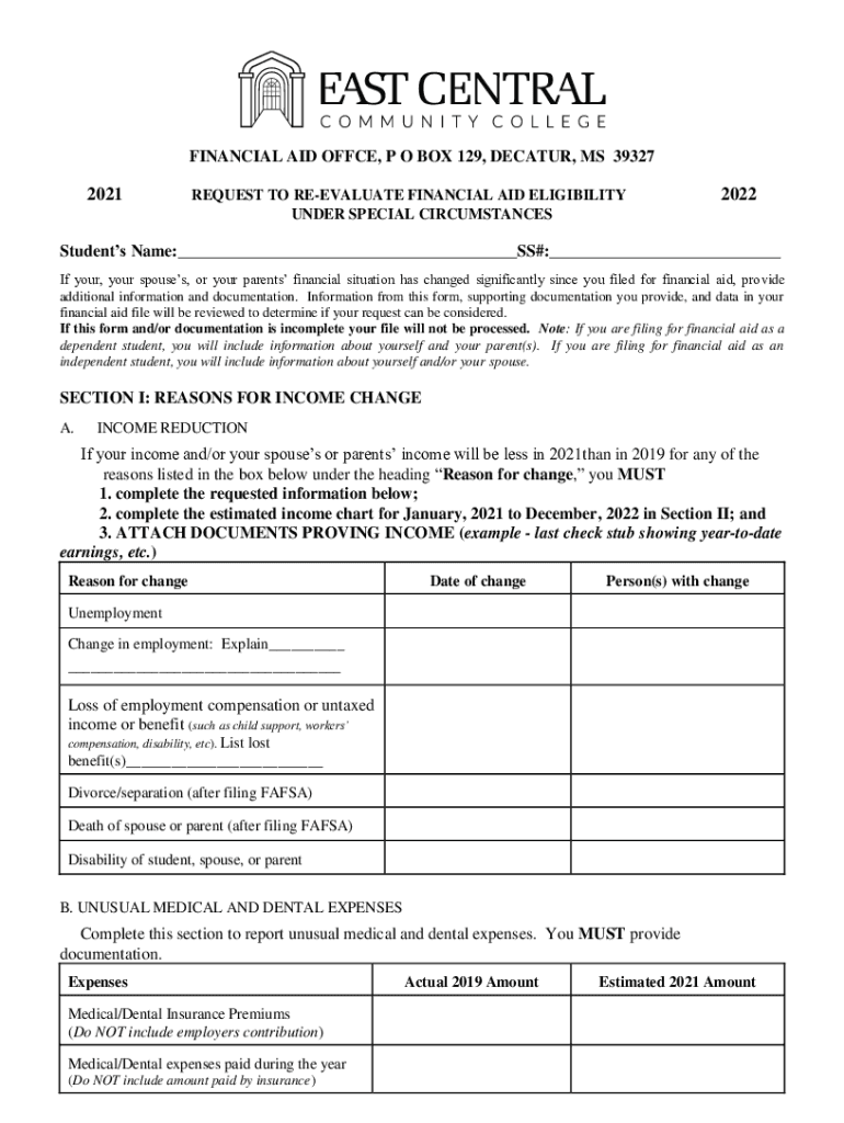 FINANCIAL AID OFFICE, P O BOX 129, DECATUR, MS 393272021REQUEST TO REEVALUATE FINANCIAL AID ELIGIBILITY UNDER SPECIAL CIRCUMSTANCES2022Students Name:___SS#:___ If your, your spouses, or your parents