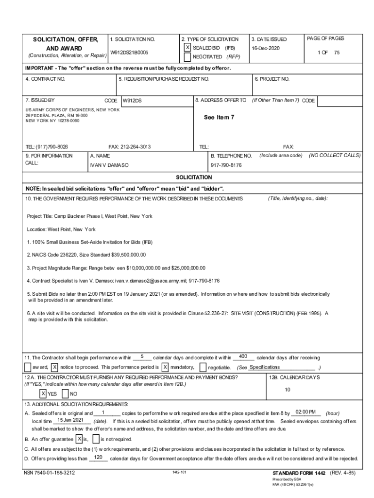 SOLICITATION, OFFER, AND AWARD1. SOLICITATION NO. W912DS21B0005(Construction, Alteration, or Repair)2. TYPE OF SOLICITATION X SEALED BID(IF)3. DATE ISSUEDPAGE OF PAGES16Dec20201 NEGOTIATED (RFP)75IMPORTANT