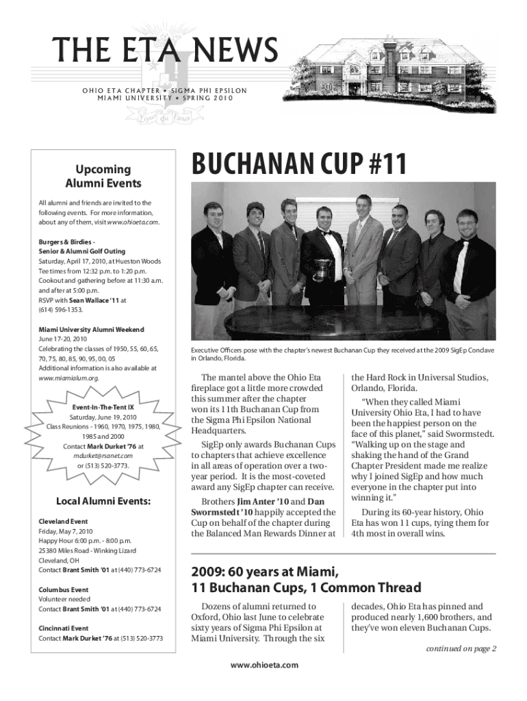 THE ETA NEWS OHIO ETA CHAPTER SIGMA PHI EPSILON MIAMI UNIVERSITY SPRING 2010Upcoming Alumni Events Buchanan Cup #11All alumni and friends are invited to the following events. For more information,