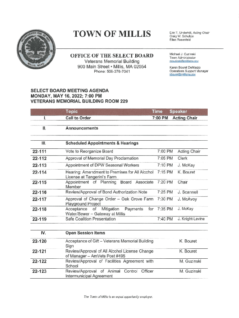 TOWNOFFICEOFTHEVeterans 900SELECTBOARDMONDAY, VETERANSMAYIll. Karen Court DeMarco Operations Support Manager kboured@mrllrsma.qovROOM2297:00PMActingChairAnnouncementsScheduledAppointments22112Approval22113Appointment22114Hearing: