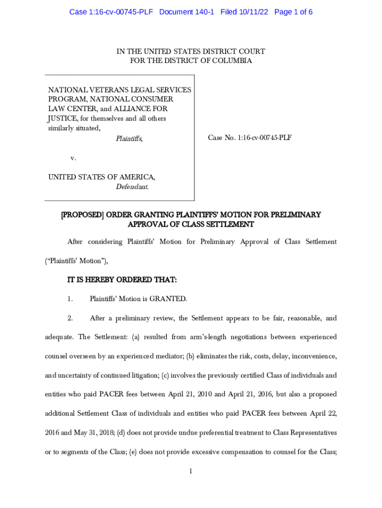 Case 1:16cv00745PLF Document 1401 Filed 10/11/22-Page 1 of 6IN THE UNITED STATES DISTRICT COURT FOR THE DISTRICT OF COLUMBIANATIONAL VETERANS LEGAL SERVICES PROGRAM, NATIONAL CONSUMER LAW CENTER,