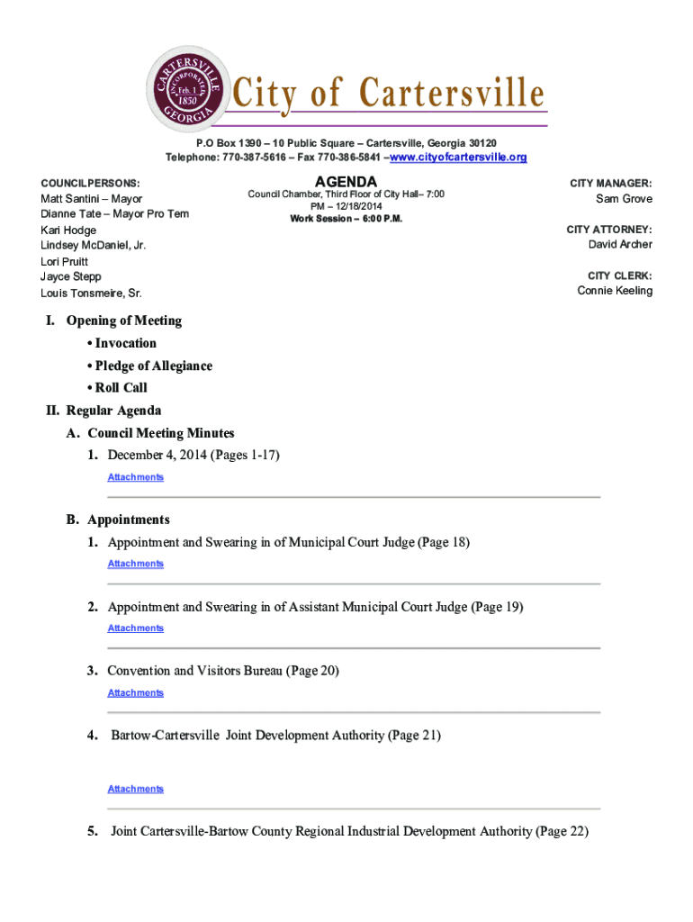 P. O Box 1390 10 Public Square Cartersville, Georgia 30120 Telephone: 7703875616 Fax 7703865841 www.cityofcartersville.orgAGENDACOUNCILPERSONS:Matt Santino Mayor Dianne Tate Mayor Pro Tem Kari Hodge