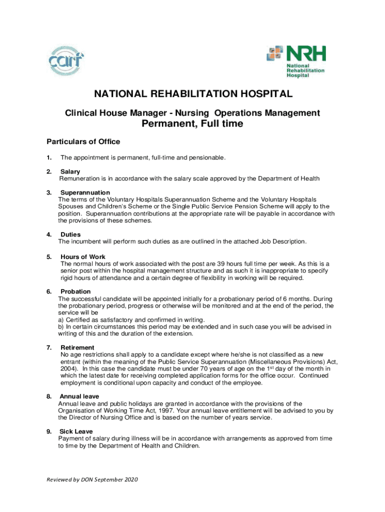 NATIONAL REHABILITATION HOSPITAL Clinical House Manager Nursing Operations ManagementPermanent, Full time Particulars of Office 1. The appointment is permanent, full time and pensionable.2. Salary