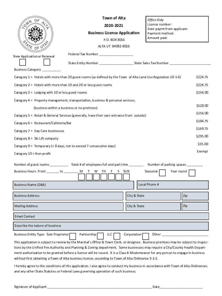 Town of AltaOffice Only License number: Date pay CT from applicant: Payment method: Amount paid:20202021 Business License Application P.O. BOX 8016 ALTA UT 840928016 New Application or Renewal Federal