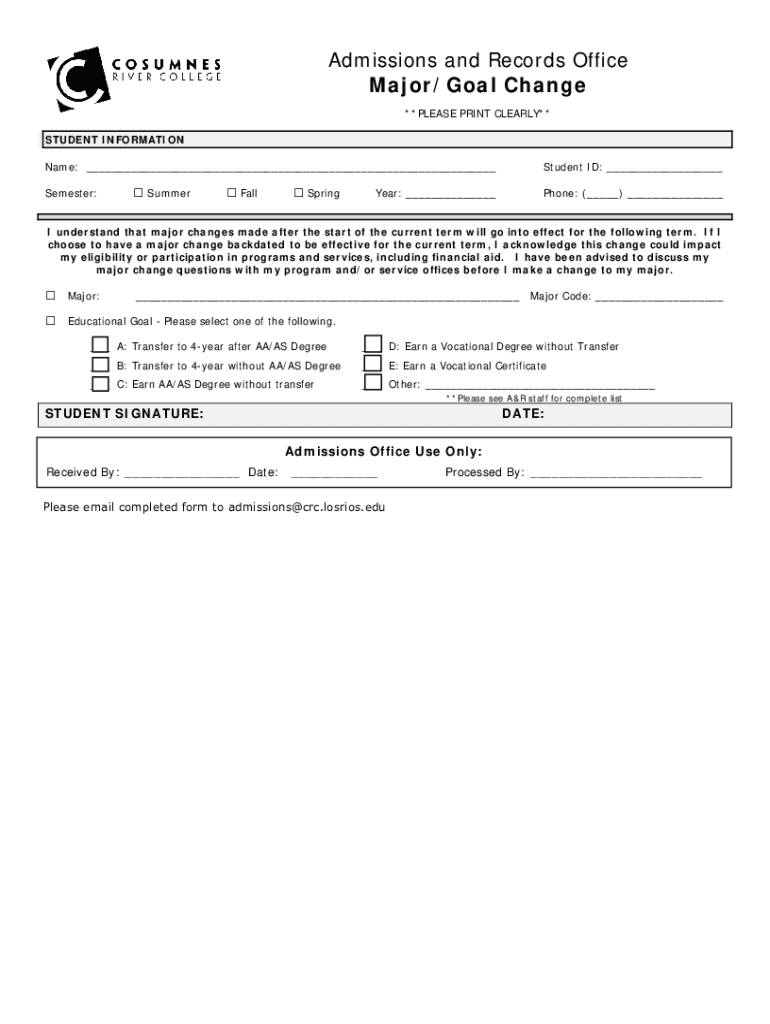 Admissions and Records Office Major/Goal Change **PLEASE PRINT CLEARLY** STUDENT INFORMATION Name: ___ Semester: Summer Fall Springsteen ID: ___Year: ___Phone: (___) ___I understand that major changes