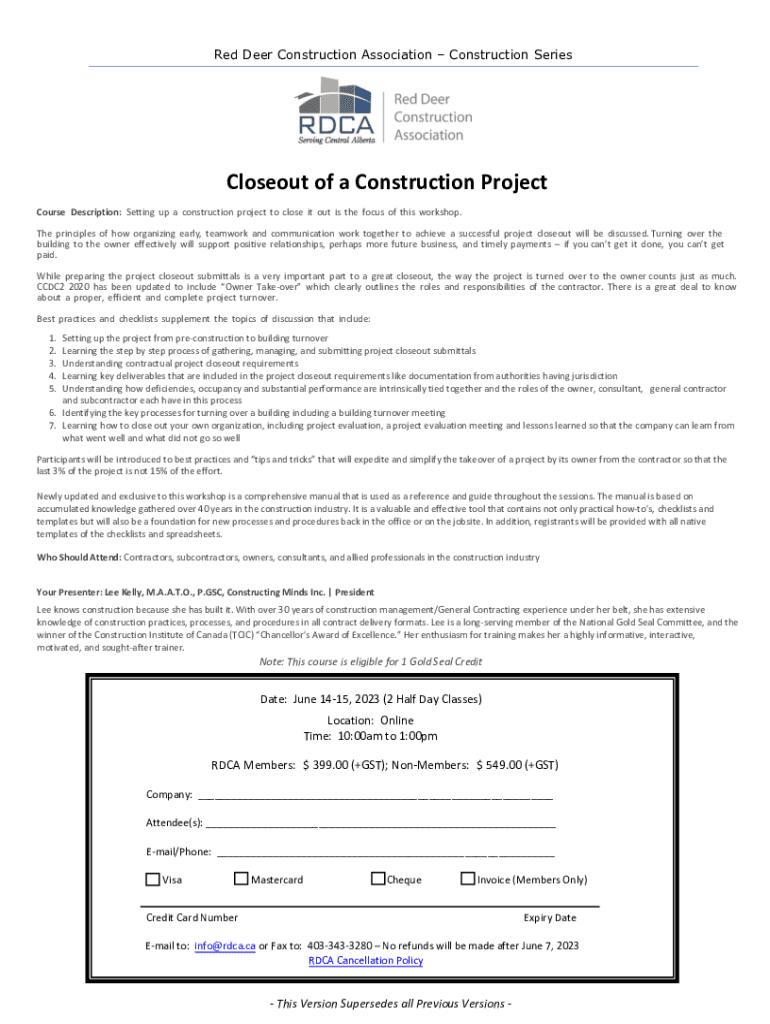 Red Deer Construction Association Construction SeriesCloseout of a Construction Project Course Description: Setting up a construction project to close it out is the focus of this workshop. The principles