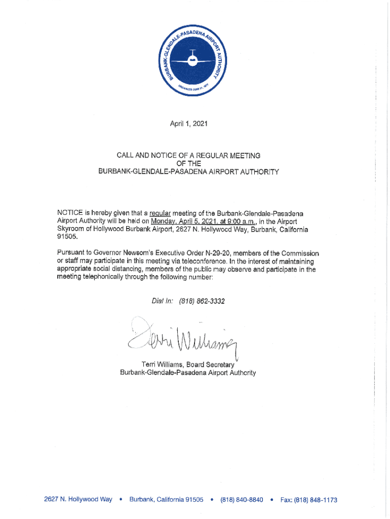 BURBANKGLENDALEPASADENA AIRPORT AUTHORITY Regular Meeting of Monday, April 5, 2021 9:00 A.M. The public comment period is the opportunity for members of the public to address the Commission on agenda