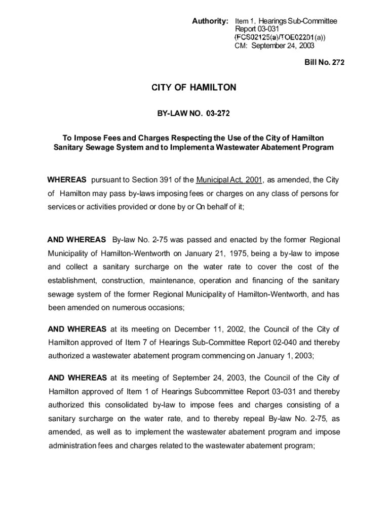 Authority: Item Hearings Subcommittee Report 03031 (a)) CM: September 24, 2003Bill No. OF HAMILTON BYLAW NO. To Impose Fees and Charges Respecting the Use of the City of Hamilton Sanitary Sewage System