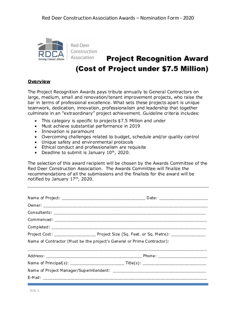 Red Deer Construction Association Awards Nomination Form 2020Project Recognition Award (Cost of Project under $7.5 Million) Overview The Project Recognition Awards pays tribute annually to General