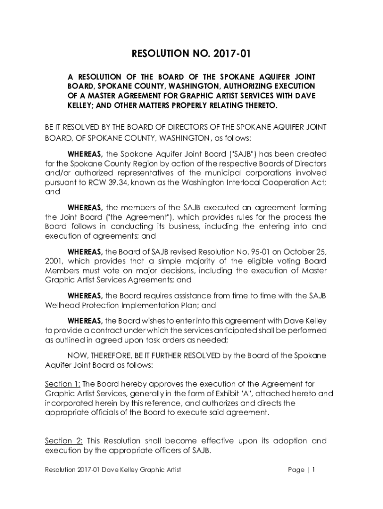 RESOLUTION NO. 201701 A RESOLUTION OF THE BOARD OF THE SPOKANE AQUIFER JOINT BOARD, SPOKANE COUNTY, WASHINGTON, AUTHORIZING EXECUTION OF A MASTER AGREEMENT FOR GRAPHIC ARTIST SERVICES WITH DAVE KELLEY;