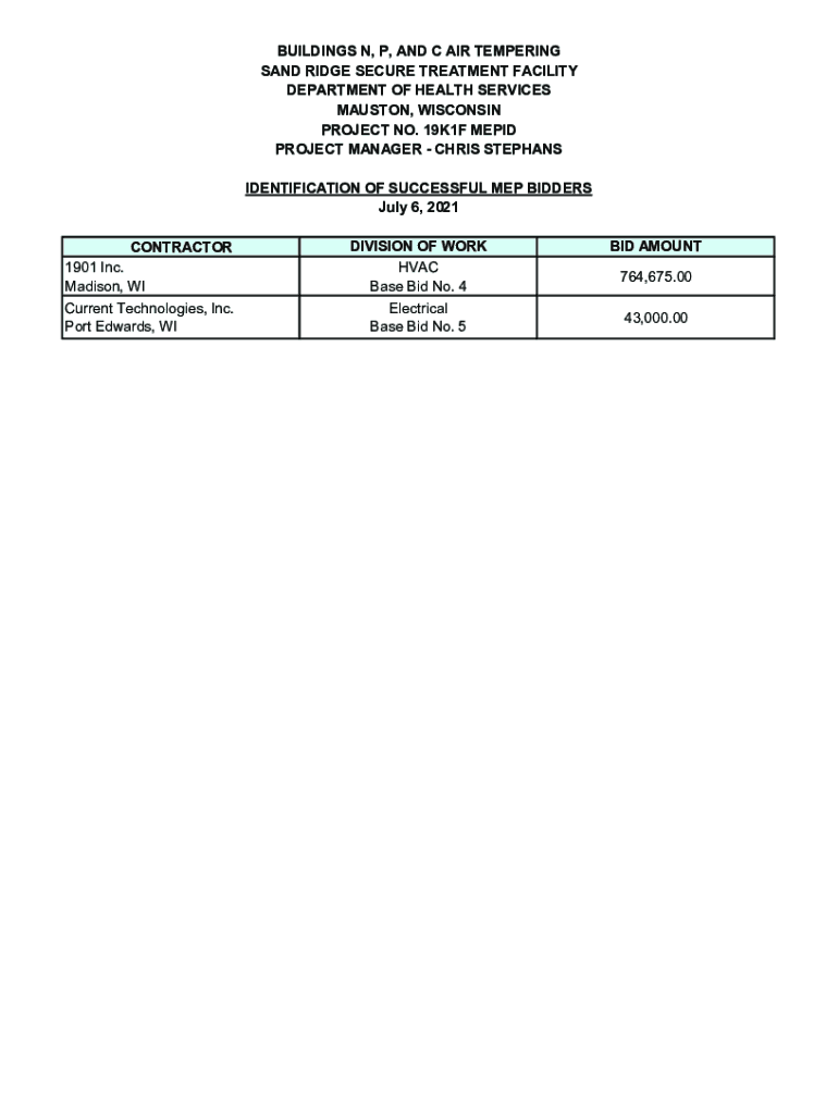 BUILDINGS N, P, AND C AIR TEMPERING SAND RIDGE SECURE TREATMENT FACILITY DEPARTMENT OF HEALTH SERVICES MANSION, WISCONSIN Projects NO. 19K1F TEPID PROJECT MANAGER CHRIS STEPHENS IDENTIFICATION OF