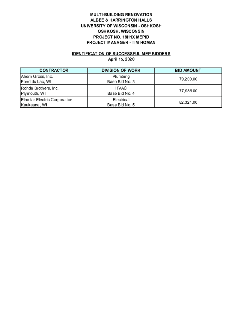 MULTIBUILDING RENOVATION ALBEE & HARRINGTON HALLS UNIVERSITY OF WISCONSIN OSHKOSH, WISCONSIN Projects NO. 18H1X TEPID PROJECT MANAGER TIM HUMAN IDENTIFICATION OF SUCCESSFUL MEP BIDDERS April 15, 2020,