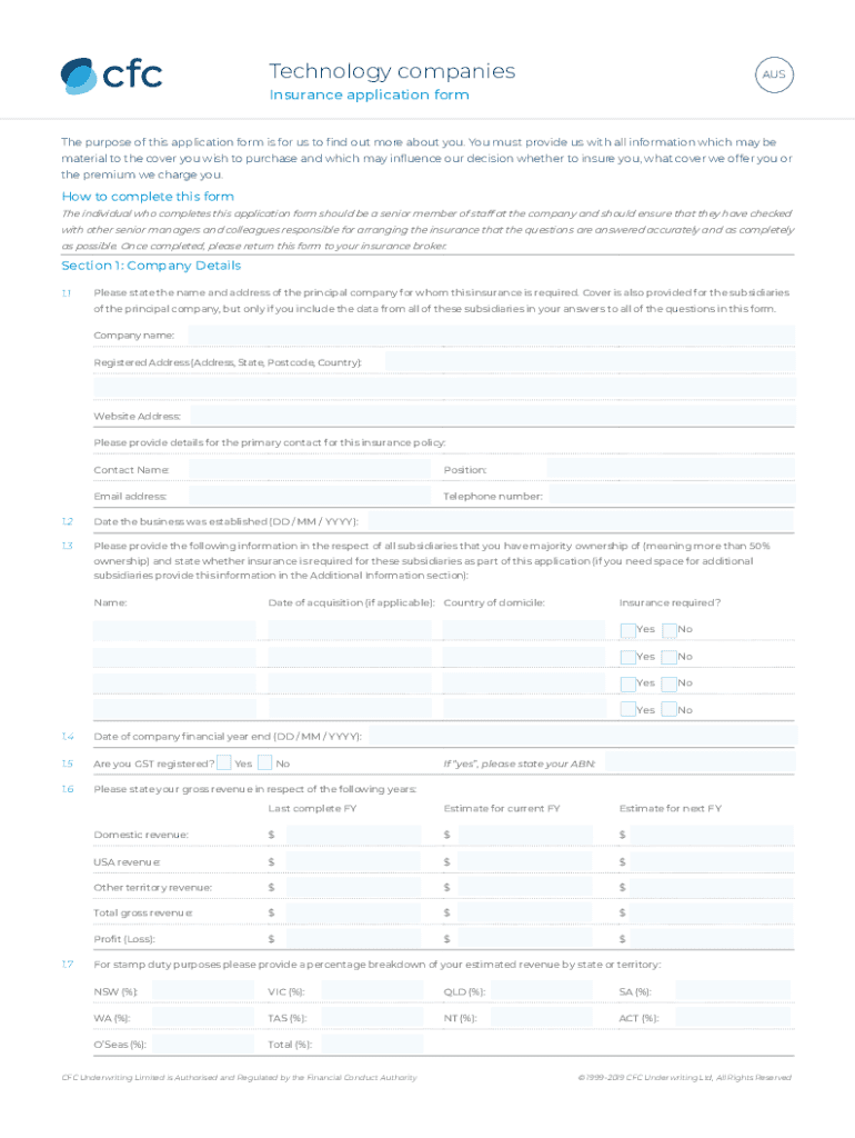 Technology companiesAUSInsurance application from The purpose of this application form is for us to find out more about you. You must provide us with all information which may be material to the cover