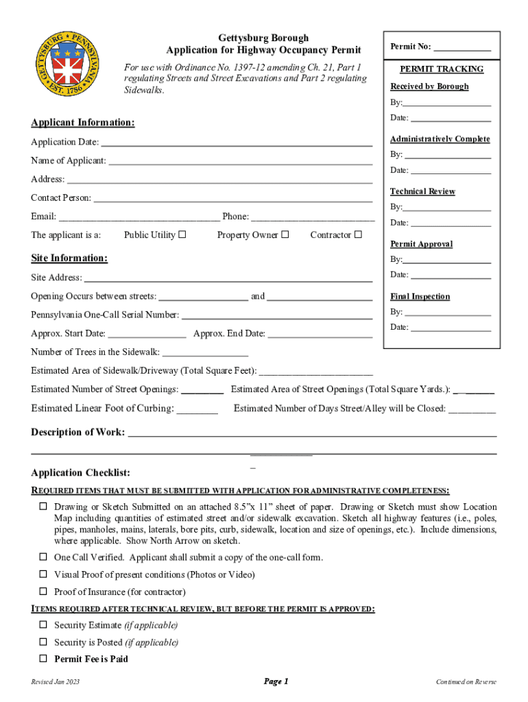 Gettysburg Borough Application for Highway Occupancy Permit For use with Ordinance No. 139712 amending Ch. 21, Part 1 regulating Streets and Street Excavations and Part 2 regulating Sidewalks. Permit