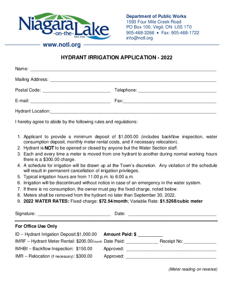 Department of Public Works 1593 Four Mile Creek Road PO Box 100, Virgil, ON L0S 1T0 9054683266 Fax: 9054681722 info@notl.orgwww.notl.org HYDRANT IRRIGATION APPLICATION 2022 Name: ___ Mailing Address: