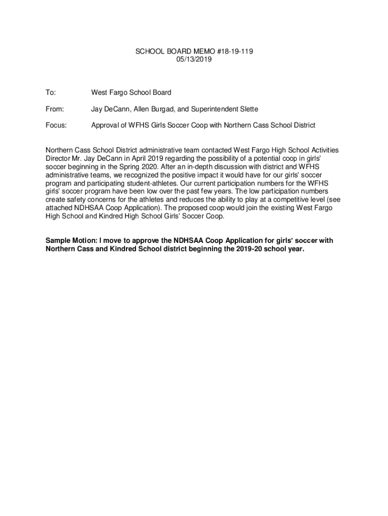 05/13/2019To:West Fargo School Boardroom:Jay Decant, Allen Bur gad, and Superintendent SletteFocus:Approval of WHS Girls Soccer Coop with Northern Class School DistrictNorthern