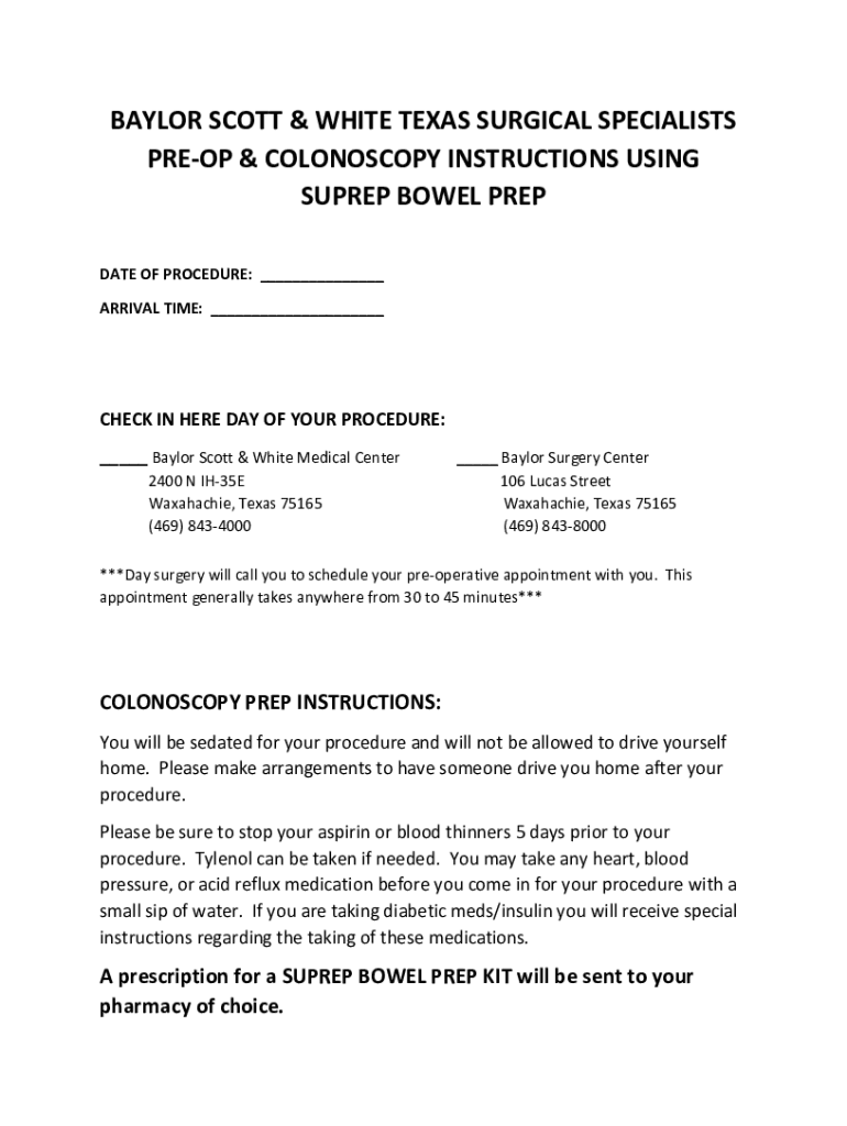 BAYLOR SCOTT & WHITE TEXAS SURGICAL SPECIALISTS PROP & COLONOSCOPY INSTRUCTIONS USING SUP REP BOWEL PREP DATE OF PROCEDURE: ___ ARRIVAL TIME: ___CHECK IN HERE DAY OF YOUR PROCEDURE: ___ Baylor Scott