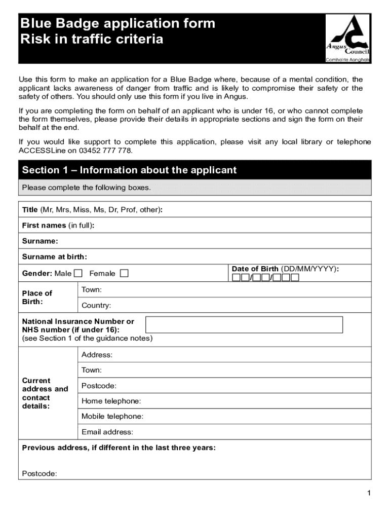 Blue Badge application form Risk in traffic criteria Use this form to make an application for a Blue Badge where, because of a mental condition, the applicant lacks awareness of danger from traffic