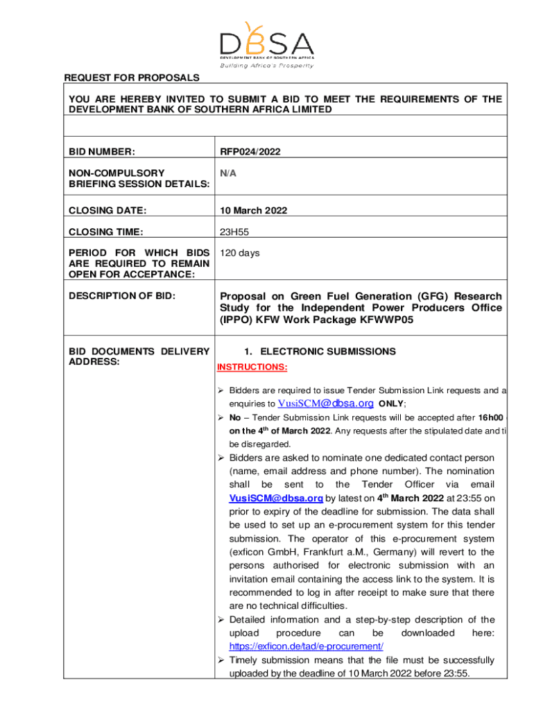 REQUEST FOR PROPOSALS YOU ARE HEREBY INVITED TO SUBMIT A BID TO MEET THE REQUIREMENTS OF THE DEVELOPMENT BANK OF SOUTHERN AFRICA LIMITED BID NUMBER:RFP024/2022NONCOMPULSORY N/A BRIEFING SESSION DETAILS: