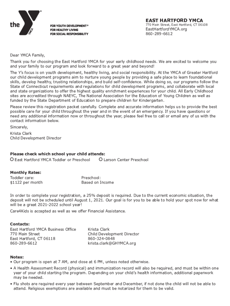 EAST HARTFORD YMCA770 Main Street, East Hartford, CT 06108EastHartfordYMCA.org 8602896612Dear YMCA Family, Thank you for choosing the East Hartford YMCA for your early childhood needs. We are excited