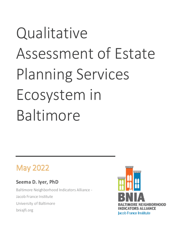 Qualitative Assessment of Estate Planning Services Ecosystem in Baltimore May 2022 Seems D. Dyer, PhD Baltimore Neighborhood Indicators Alliance Jacob France Institute University of Baltimore bhaji.
