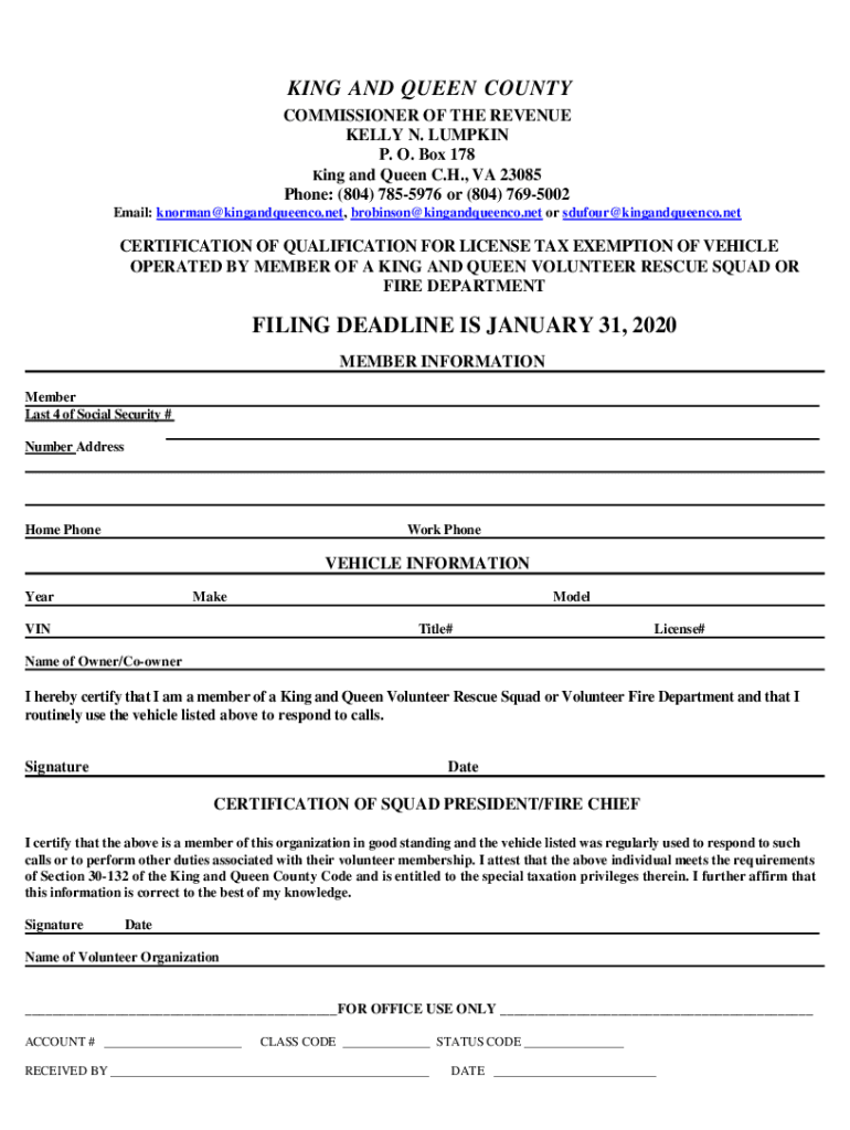 KING AND QUEEN COUNTY COMMISSIONER OF THE REVENUE KELLY N. LUMPKIN P. O. Box 178 King and Queen C.H., VA 23085 Phone: (804) 7855976 or (804) 7695002 Email: knorman@kingandqueenco.net, brobinson@kingandqueenco.net