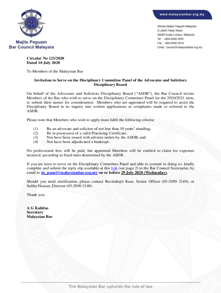 Circular No 221/2020 Dated 10 July 2020 To Members of the Malaysian Bar Invitation to Serve on the Disciplinary Committee Panel of the Advocates and Solicitors Disciplinary Board On behalf of the