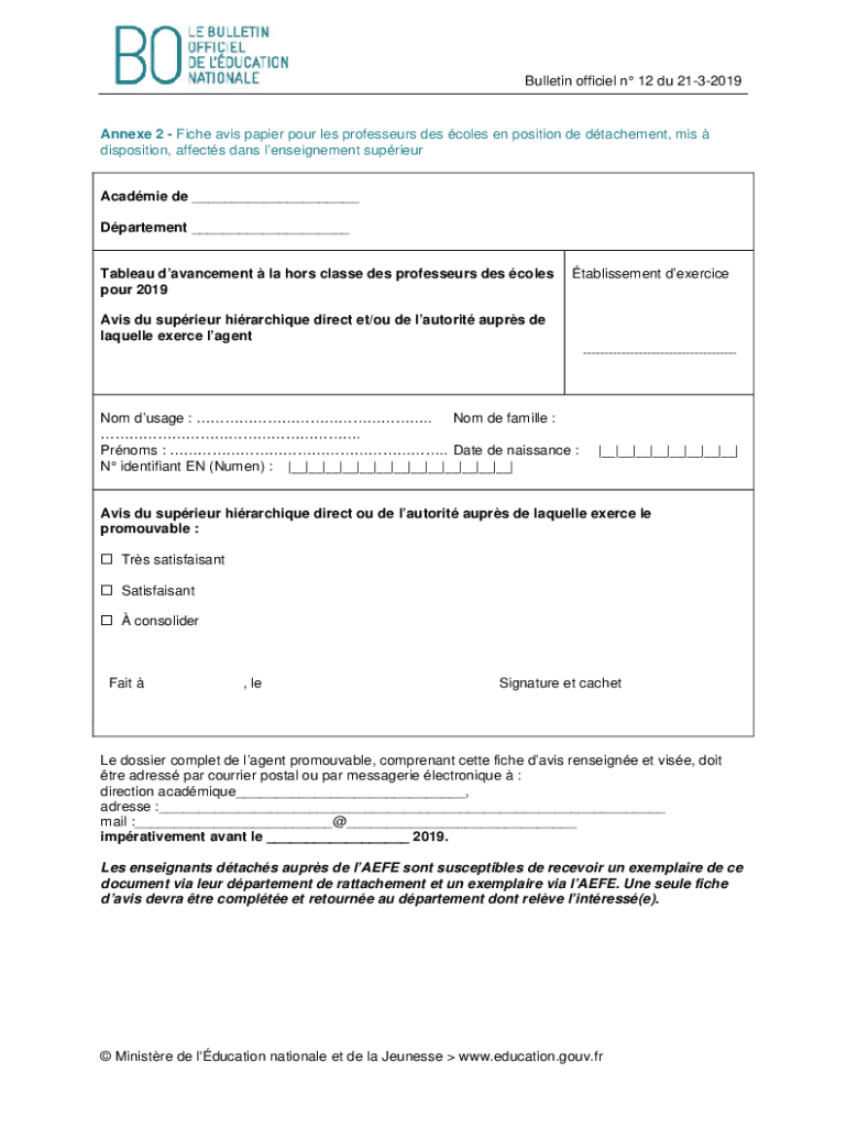 Bulletin official n 12 Du 2132019Annexe 2 Fiche Avis paper pour LES professors DES cols en position DE detachment, MIS