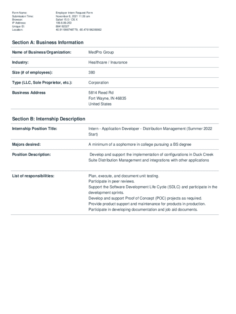 Form Name: Submission Time: Browser: IP Address: Unique ID: Location:Employer Intern Request Form November 8, 2021 11:26 am Safari 15.0 / OS X 199.8.89.253 884182327 40.911998748779, 85.476196289062Section