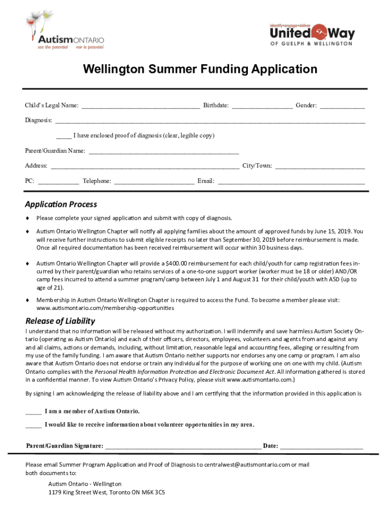 Get the free Wellington Summer Funding Application - Autism Ontario