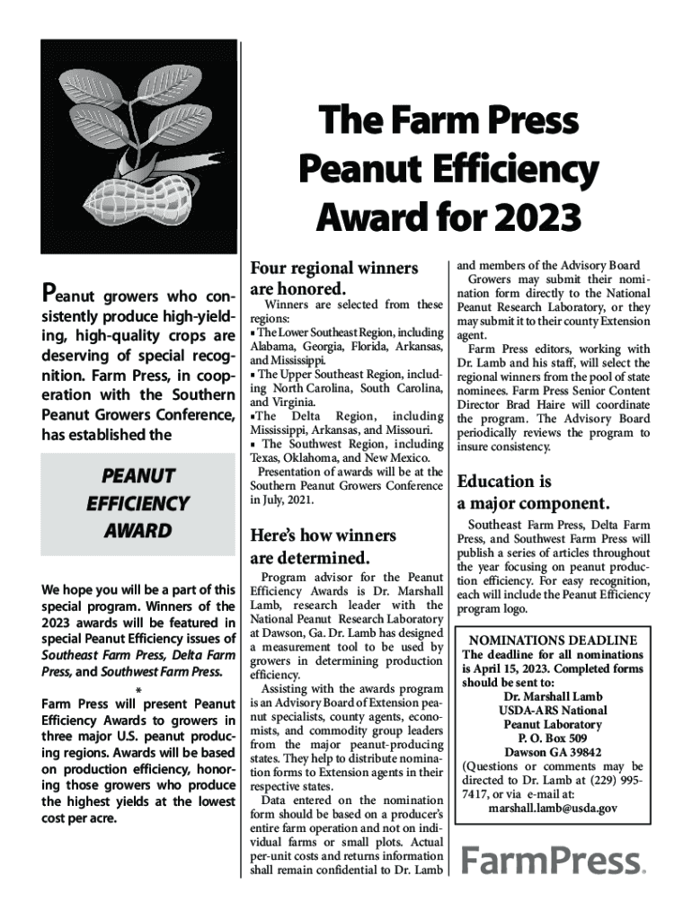 The Farm Press PeanutEfficiency Award for 2023 Four regional winners honored. Peanut growers who con airliners are selected from these silently produce high yielding, high quality crops are deserving