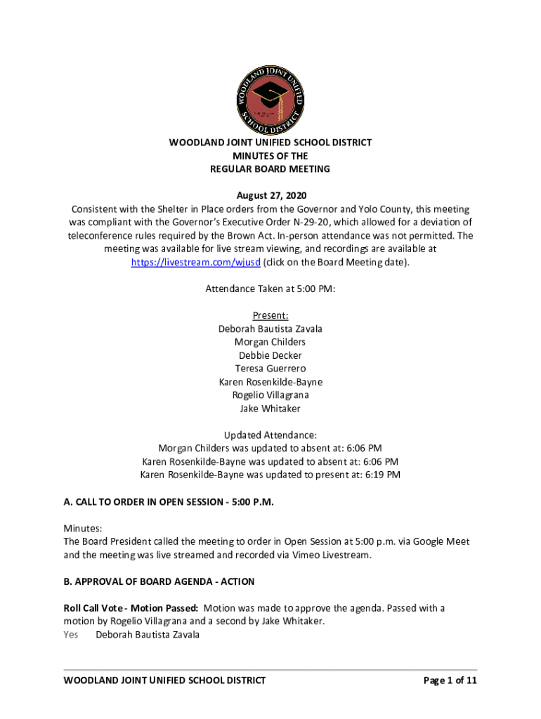 WOODLAND JOINT UNIFIED SCHOOL DISTRICT MINUTES OF THE REGULAR BOARD MEETING August 27, 2020, Consistent with the Shelter in Place orders from the Governor and YOLO County, this meeting was compliant