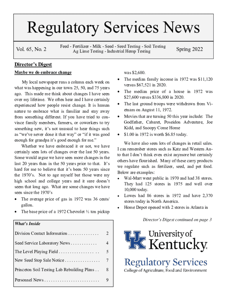 Regulatory Services News Vol. 65, No. 2Feed Fertilizer Milk Seed Testing Soil Testing Ag Lime Testing Industrial Hemp TestingSpring 2022Directors Digest Maybe we do embrace change My local newspaper