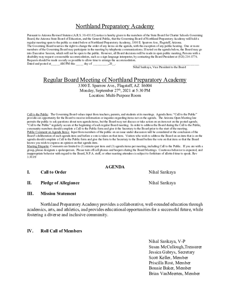 Northland Preparatory Academy Pursuant to Arizona Revised Statutes (A.R.S. 38431.02) notice is hereby given to the members of the State Board for Charter Schools Governing Board, the Arizona State