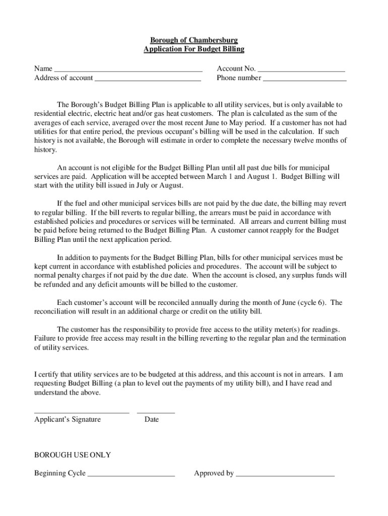 Borough of Chambersburg Application For Budget Billing Name ___ Address of account ___Account No. ___ Phone number ___The Boroughs Budget Billing Plan is applicable to all utility services, but is