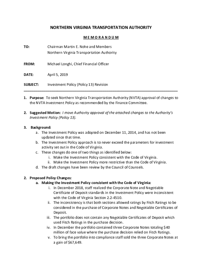 NORTHERNVIRGINIATRANSPORTATIONAUTHORITY MEMORANDUM TO: ChairmanMartinE. NoheandMembers NorthernVirginiaTransportationAuthority FROM: MichaelLonghi, ChiefFinancialOfficer DATE: April5,2019 SUBJECT: