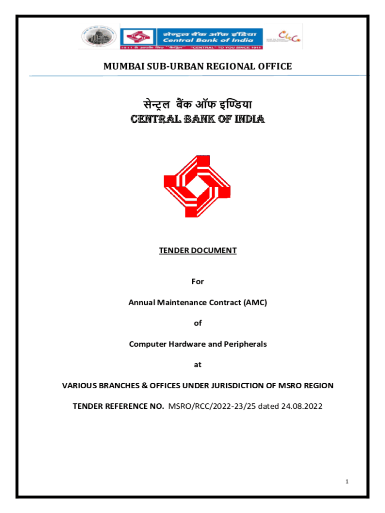 MUMBAI SUBURBAN REGIONAL OFFICE CENTRAL BANK OF INDIATENDER Document Annual Maintenance Contract (AMC) of Computer Hardware and Peripherals at VARIOUS BRANCHES & OFFICES UNDER JURISDICTION OF MRO