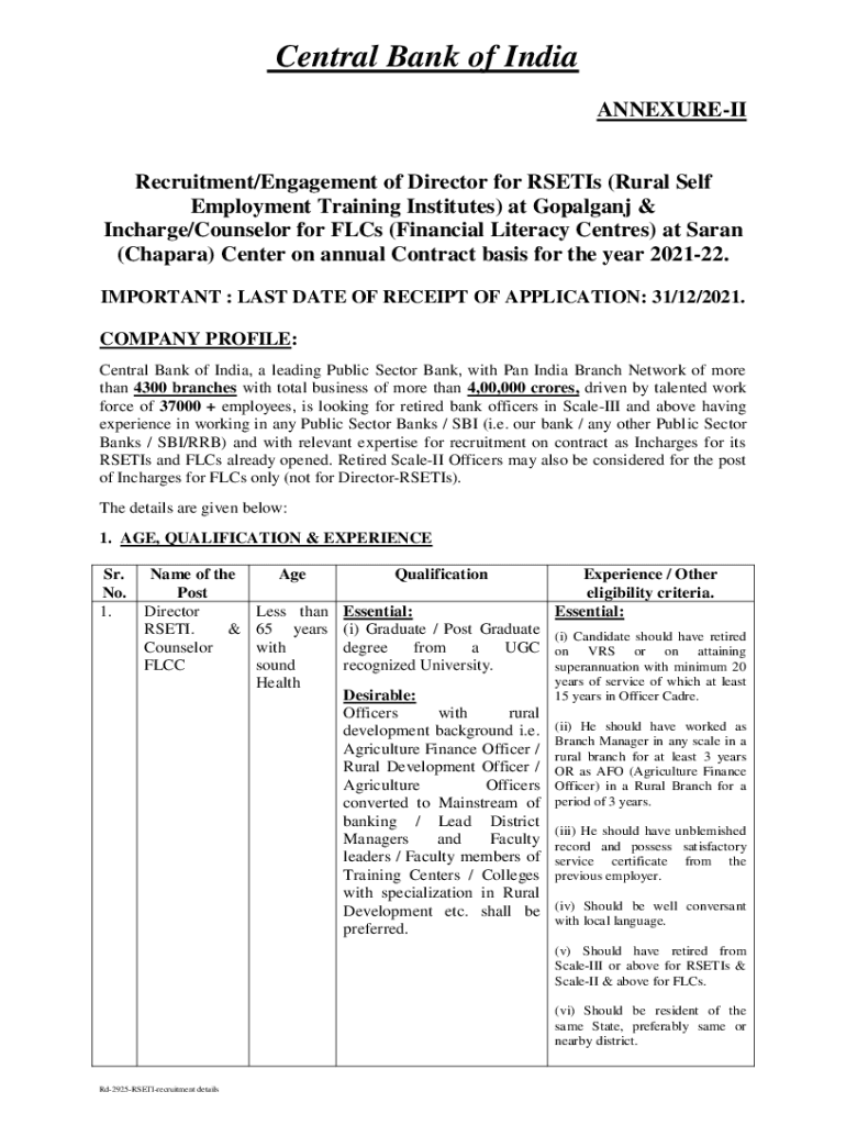 Central Bank of India ANNEXUREIIRecruitment/Engagement of Director for Sets (Rural Self Employment Training Institutes) at Gopalganj & In charge/Counselor for FCS (Financial Literacy Centers) at Saran