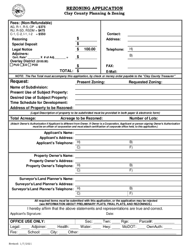 REZONING APPLICATION Clay County Planning & Zoning Fees: (NonRefundable) AG, R1, R5, OP $375 RU, RED, RSM $475 C1, C2, I1, I$$$2550 rezoning Special Deposit Legal Notice Ad joiners: Cert. Rate* ___