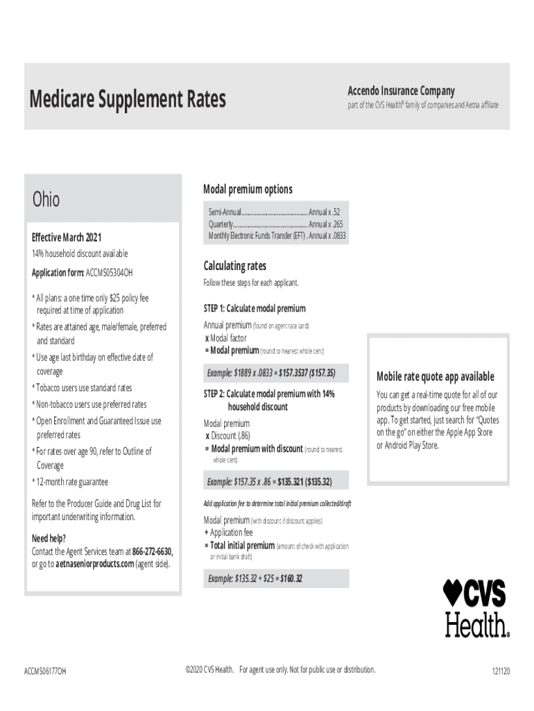 Accent Insurance Company Medicare Supplement Rates Ohio Effective March 2021 14% household discount available Application form: ACCMS05304OH All plans: a one time only $25 policy fee part of the CVS