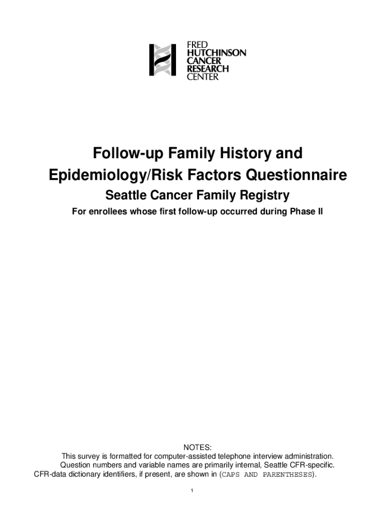 Followup Family History and Epidemiology/Risk Factors Questionnaire Seattle Cancer Family Registry For enrolled whose first followup occurred during Phase MINUTES: This survey is formatted for computer