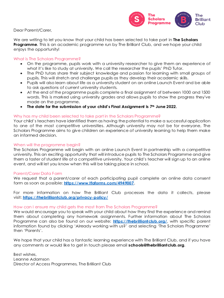 Dear Parent/Carer, We are writing to let you know that your child has been selected to take part in The Scholars Program. This is an academic program run by The Brilliant Club, and we hope your child