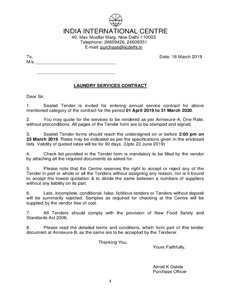 INDIA INTERNATIONAL Center 40, Max Mueller Mary, New Delhi110003 Telephone: 24609426, 24609351 Email: purchase@iicdelhi.in To, M/s ___Date: 16 March 2019___ LAUNDRY SERVICES CONTRACT Dear Sir, 1.